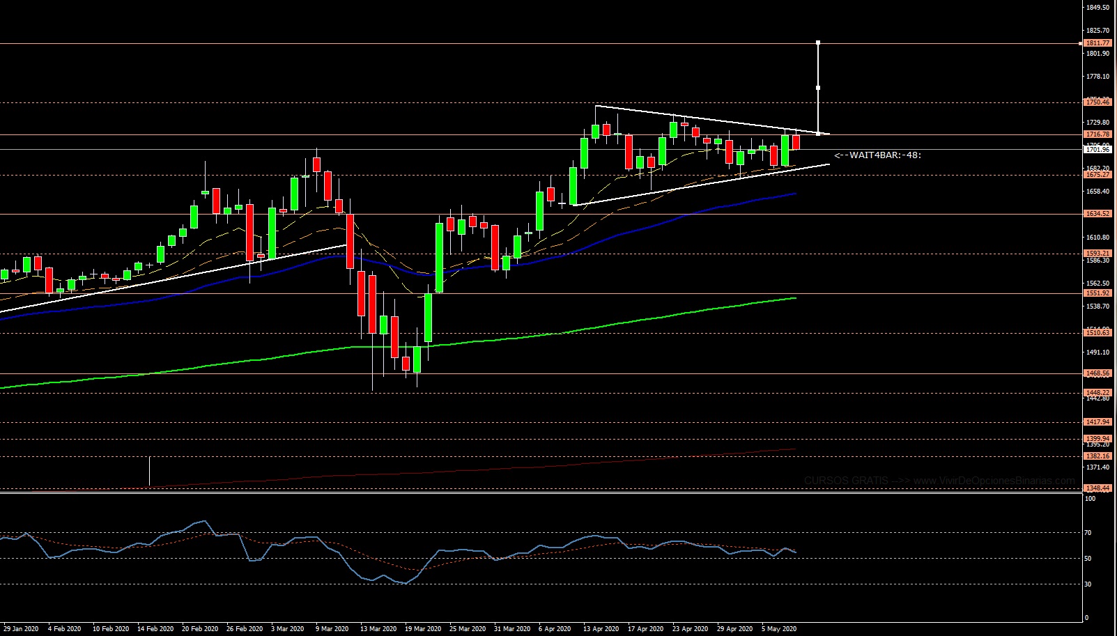 Se l'uscita dovesse essere verso l'alto, le quotazioni potrebbero raggiungere area 1750 e più in alto, considerando anche la soglia psicologica di 1800, individuamo area 1810, proiettando in su l'altezza del triangolo.