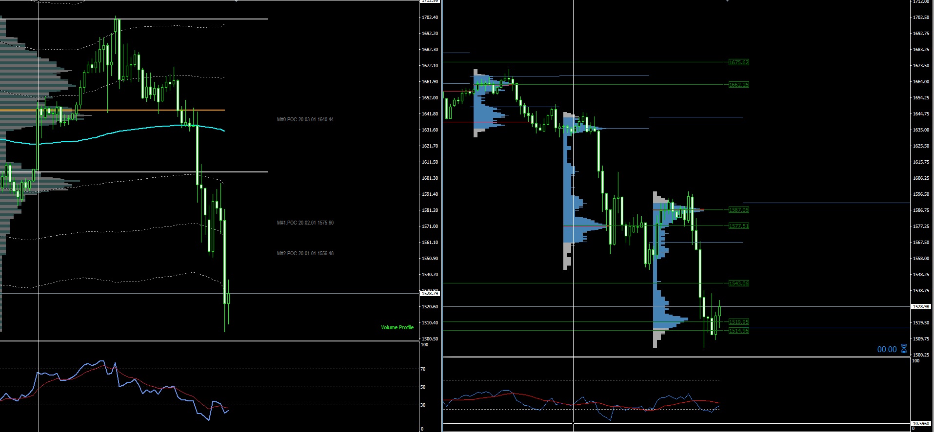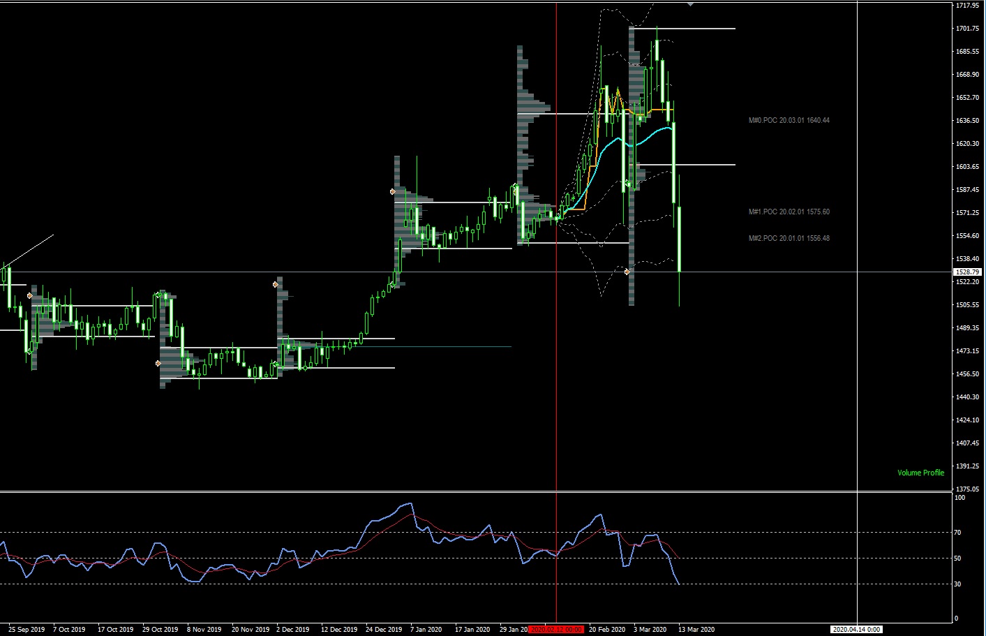 In caso di recupero delle quotazioni, i primi livelli da monitorare sono 1587 e 1601, dove si trova la VAL del Profile mensile, mentre il VWAP settimanale si trova in area 1634. Se dovesse continuare la discesa, andrei a monitorare il livello 1450, dove troviamo un supporto statico.